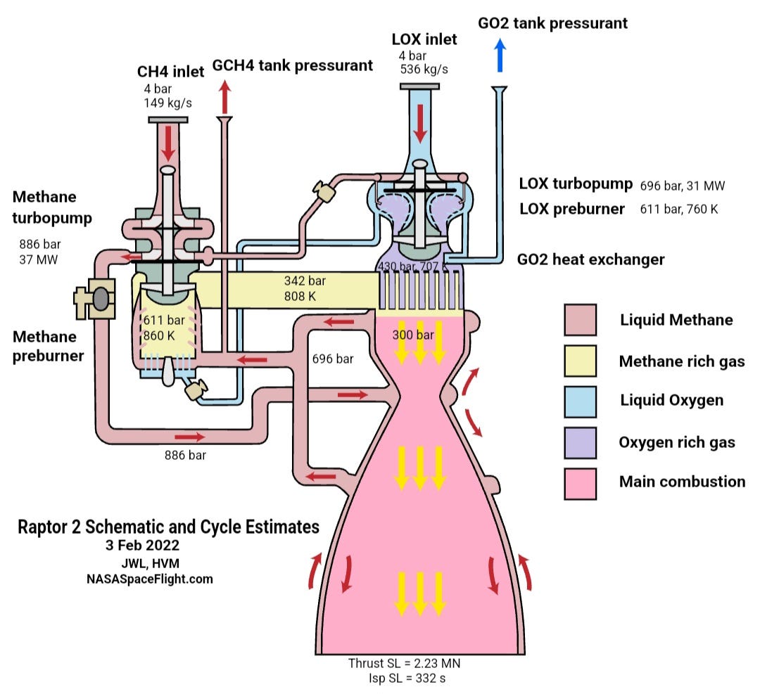 This colourful diagram is a full flow staged combustion methane-oxygen rocket engine. Take a deep breath now and skip the next paragraph if you're headache-prone, because how it works is…