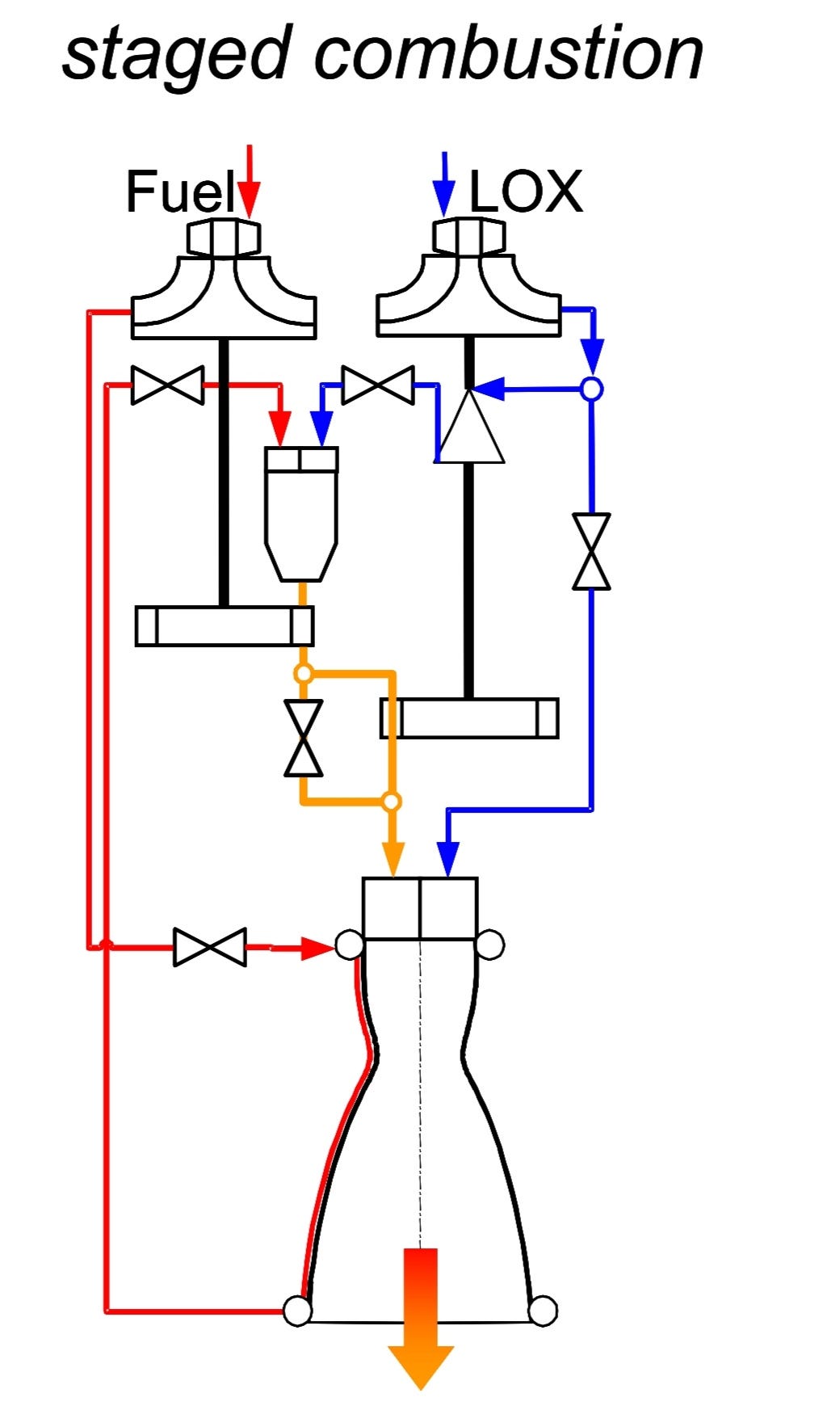 Now, think back even harder: As you remember, a fundamental limitation of the gas generator cycle is that in order to keep the turbine alive and not reduce it to a gooey mess you need to burn either fuel or oxy-rich in the preburner to keep the temperature down. This means that we're leaving money on the table, because a fuel or oxy-rich exhaust is still usable propellant.