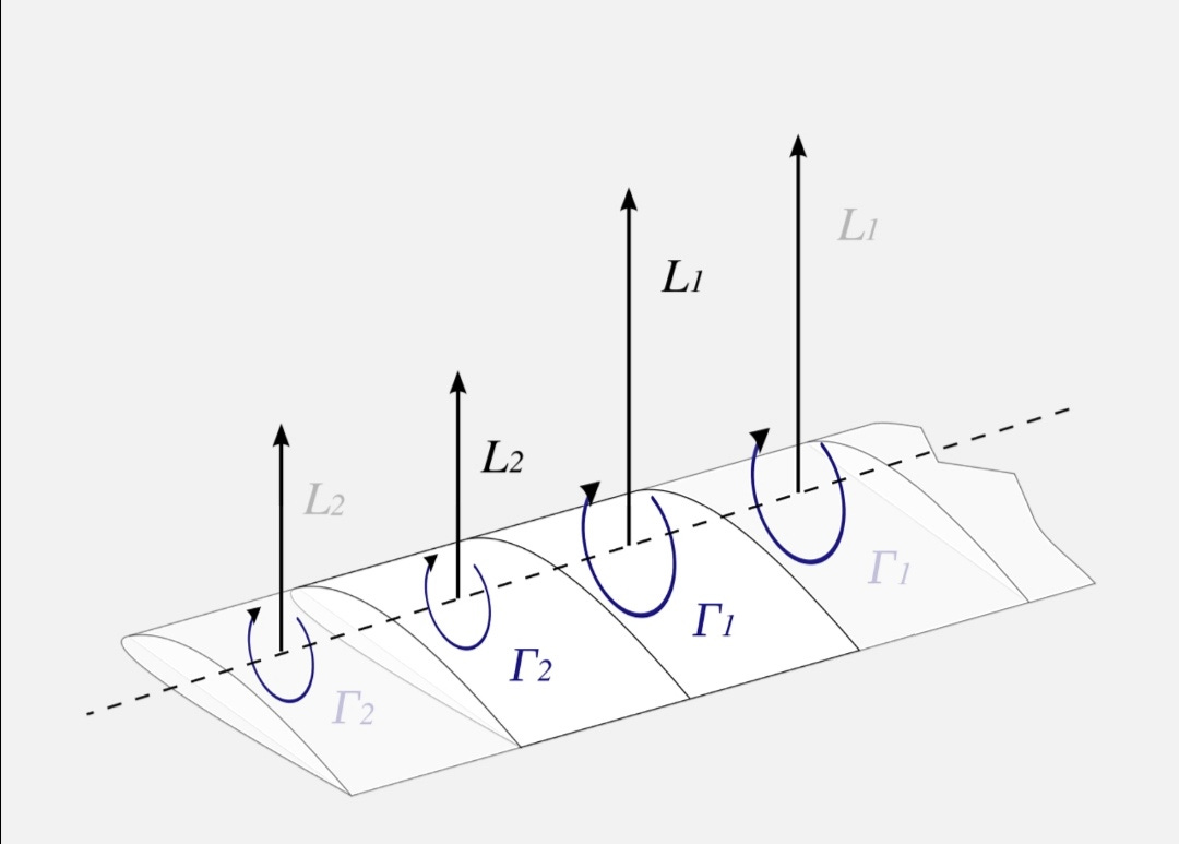 Where there is a difference between circulation strengths between adjacent sections in this bound vortex (resulting from, say, differences in wing segment area or a boundary), simple geometry tells us that this results in a perpendicular vortex stream being generated to account for this velocity difference. In lifting line theory this is assumed to be shed downstream but remain bound in the spanwise direction to the wing segment it originated from: That last bit doesn't map onto reality, but remember this is an approximation!