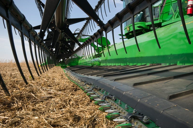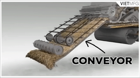 Once the stalks are cut, the reel deposits them onto a horizontally-moving belt or auger, that draws the cut stalks inwards to the axis of the combine and onto a grain conveyor that pulls it into the innards of the machine. Here the harvested stalks enter the next, and most important, stage: The rotary mechanical heart that is the threshing drum.
