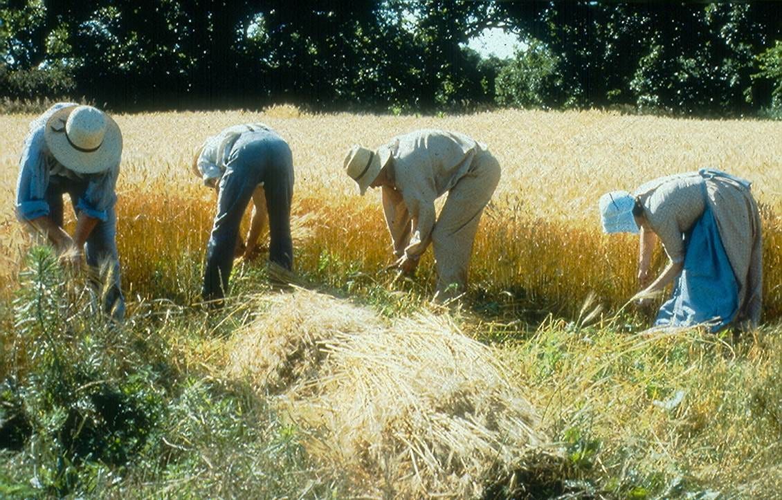 -Or lots of experienced reapers, because one bloke isn’t going to go out into a large farm and do it all by hand. This is a big job and needs more than a man with a bladed stick, no matter how charming the image. It’s also a multi-part job, as cutting the stalks is only one aspect of gathering the crop; traditionally, the men with the scythes would be followed by other men or women who would gather the crop and, in the case of wheat, bind it into bundles to be stood up and dried in the sun.