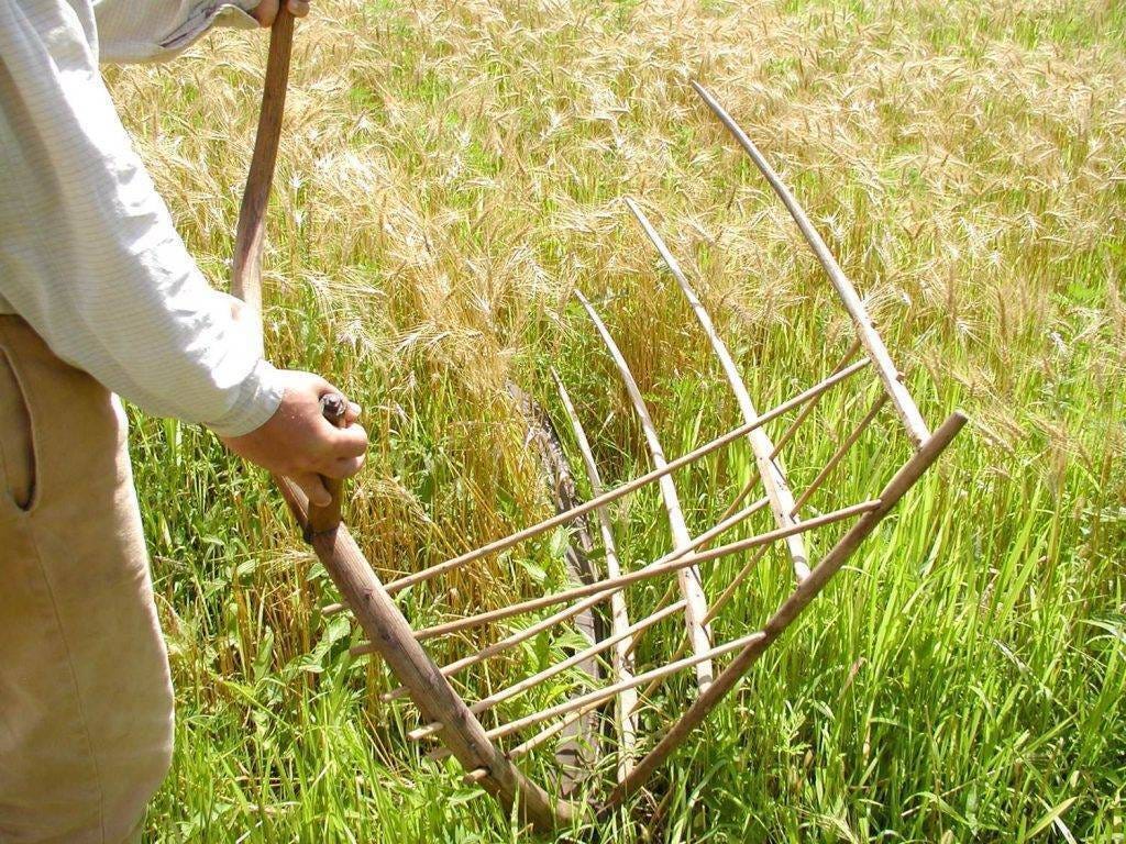 Traditionally, reaping would be done by a man with a scythe or a grain cradle, which can be thought of as a sort of multi-level scythe with fun little basket features. This neatly severs the stalks and deposits them in a sweeping two-handed motion that can be performed upright, using the strength of arm, hip & leg. A neat ergonomic solution that minimizes back-strain, it’s also surprisingly quick when done by an experienced reaper.