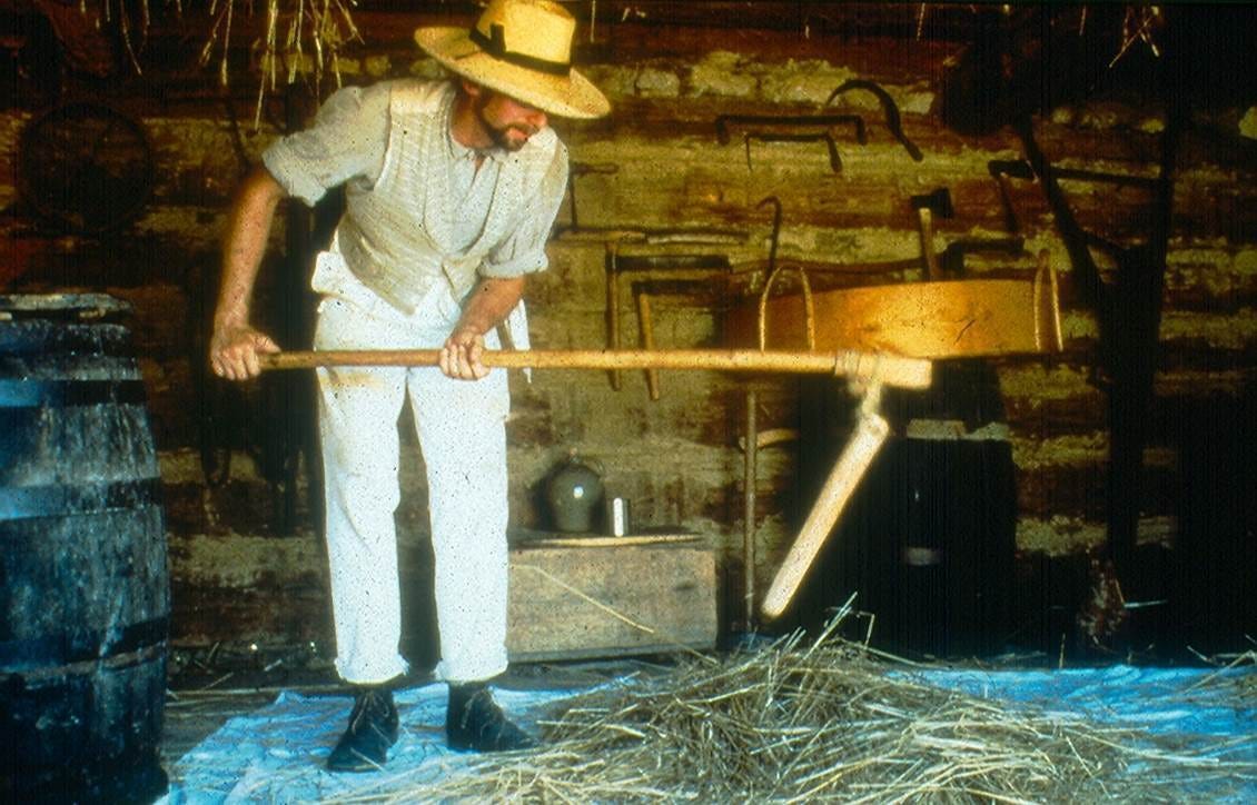 A wheat flail is a long stick, coupled by a flexible joint such as a leather thong to a shorter, heavier stick (the beater). With this a man can physically beat wheat into submission on a stone floor or a tarp, breaking the bond between the grain kernel and the rest of the plant. It’s doable, but bloody exhausting: One man with a wheat flail can flail about 7 bushels (420 pounds) of wheat a day. That sounds like a lot, but a large farm can produce thousands of tons, making wheat flailing an activity for an entire agricultural army, as it was back in the day.