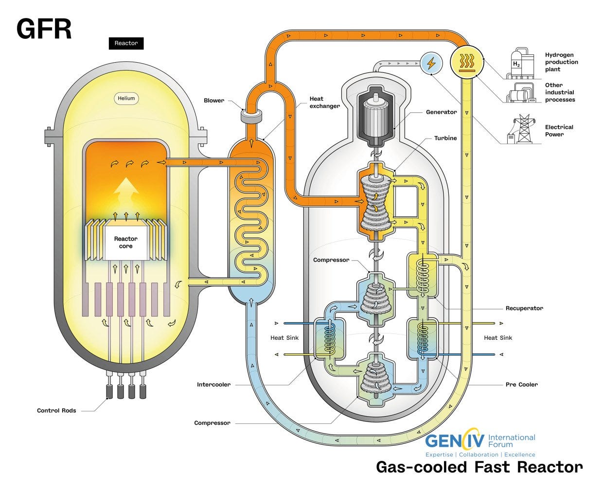 Like the Very High Temperature Reactor, the GFR enables incredible core outlet temperatures, limited largely by metallurgy: 850 Celsius is quite attainable, and higher still could be possible with the right material advances, such as silicon carbide composites for fuel cladding. This super-high core exit temperature is handy if you want to pair it with hydrogen synthesis at industrial scale, which gets significantly easier and less energy intensive at high temperatures. And it's not just about clean hydrogen: Decarbonization of oil refining is also possible at such temperatures, if you fancy a rich seam of irony in your clean powerplants.