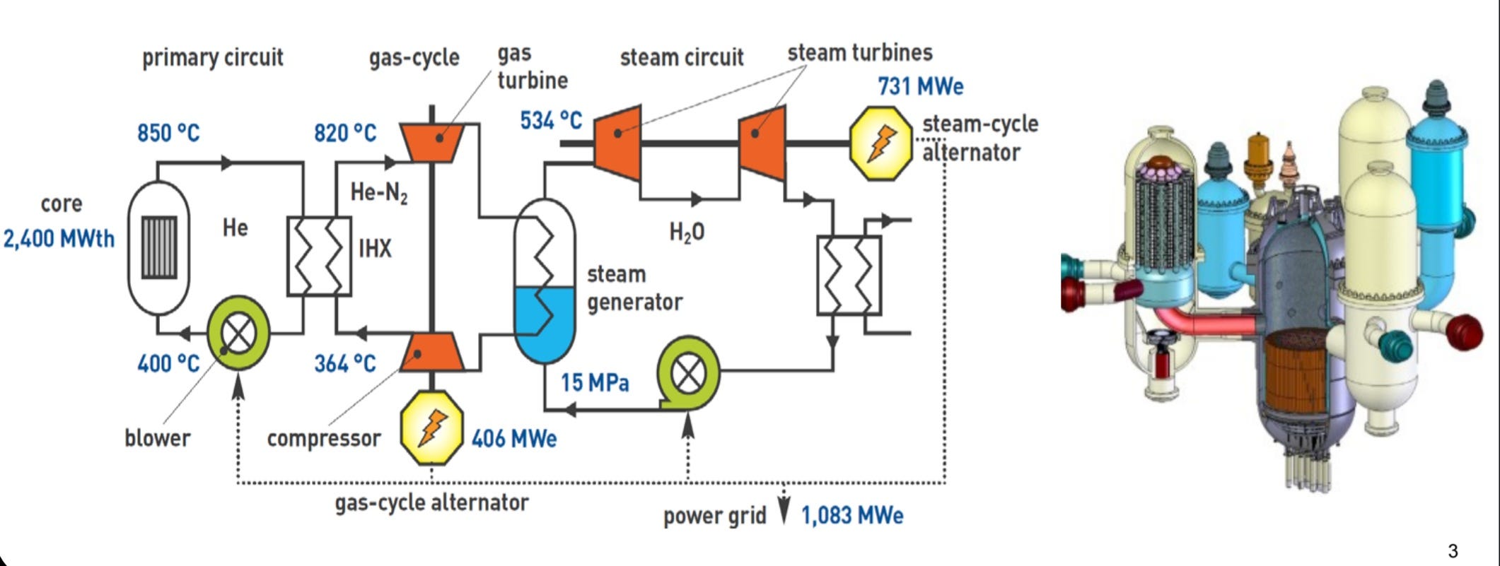 But unlike the graphite-moderated VHTR, with a core power density of only about 5 Megawatts per cubic meter, the GFR fast reactor has a core power density twenty times higher, at close to 100 Megawatts per cubic metre! This is comparable to a standard Pressurised Water Reactor (PWR), which matters for compactness, cost effectiveness and modular build potential. The very low power density of the Chinese VHTR, by contrast, renders it absolutely massive, even though the power output of the high temperature core isn't all that impressive. But the GFR combines useful levels of output with small, practical build size. Fantastic!