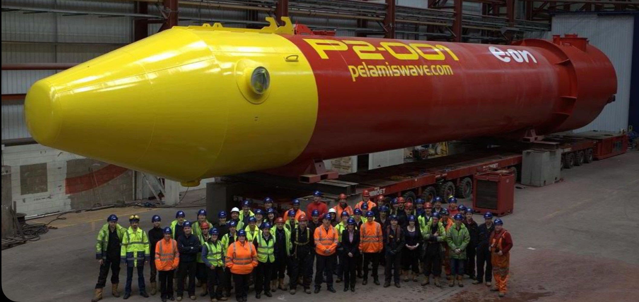 Probably the most famous example of a wave attenuator device is the Pelamis device, which formed the world’s largest wave farm in the world, generating 2.25 MegaWatts off the coast of Portugal until violent weather wrecked it. The Pelamis was a charismatic beastie, one hundred and twenty metres long and floating like a giant sea-snake on top of the waves, generating power by the twisting and bobbing between different sections, which pressurized an internal hydraulic system to generate power.