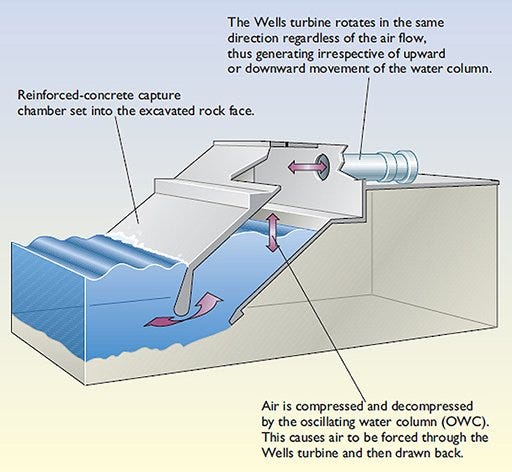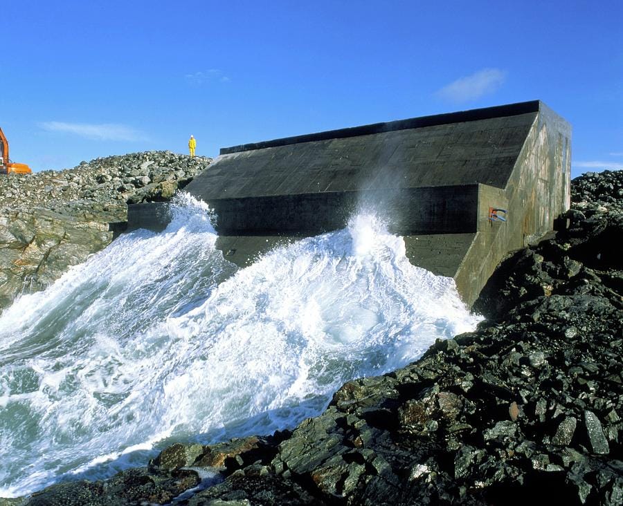 A terminator is a device which in some way stands in the way of the wave, gritting its teeth and taking the brunt of the impact, like many of us have on holiday, digging our toes into the sand and going into Portugal’s Atlantic-coast waves shoulder-first. When we do this we usually end up on our arse, pummelled by churning froth, and so this is one of the more King Canut-style power generation methods. Ballsy but brutal.