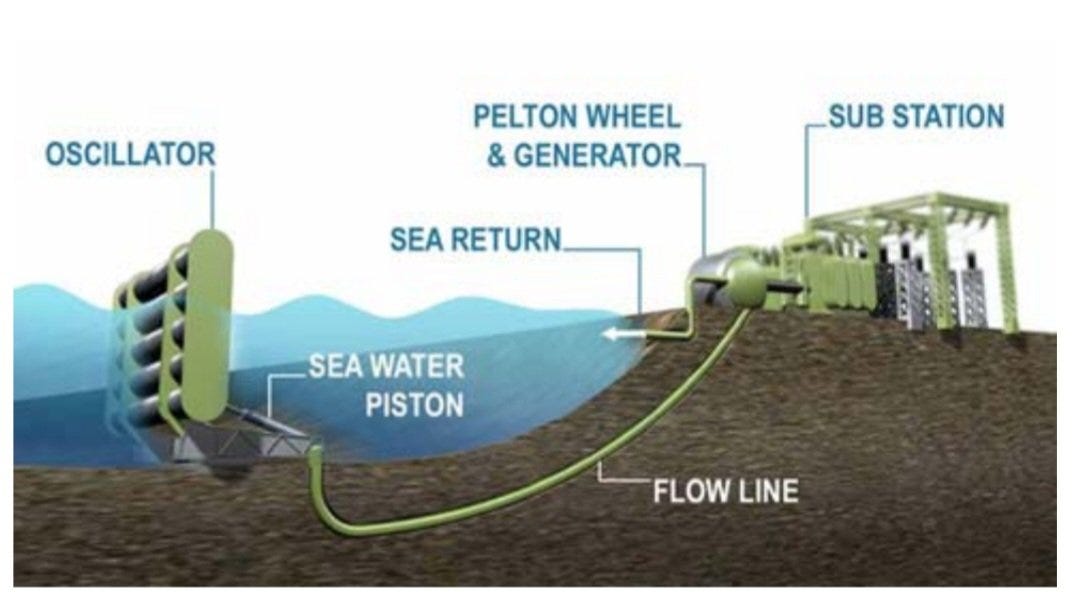Another way of generating wave power through the ‘Terminator’ method (a macho name) is Aquamarine’s ‘Power Oyster’, which has a less macho name. This comprised a semi-buoyant breakwater oscillator which stood in the way of waves and drove a subsea piston that pushed seawater through a long flowline to a generating unit on the shore. This generating unit would use a Pelton wheel generator to create electricity from the high-speed seawater.