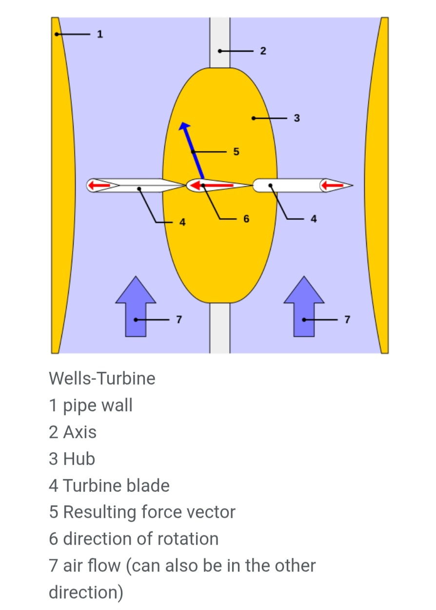 The limpet is a terminator device that works on the principle of an oscillating water column, forcing incoming waves under a concrete channel into a huge plenum chamber, where the water level rises and falls, creating a rise & fall in air pressure that drives a Wells air turbine and generates electricity. In this way, the primary mover uses air rather than water, and spreads out the rhythmic impulse generated by the waves somewhat. This is assisted by the Wells turbine itself, which is a unique design with perpendicular blades that rotate in the same direction no matter if the air is coming into the turbine or out of it. This comes at a trade-off in turbine efficiency, at between 40% and 70% efficiency compared to the much higher efficiencies achieved by ducted one-directional turbines, which can exceed 90% in ideal conditions. The loss of efficiency is a trade-off that allows for mechanical simplicity and a more constant rate of revolution from wave to wave: Both useful in a harsh, variable environment where corrosion is an issue.