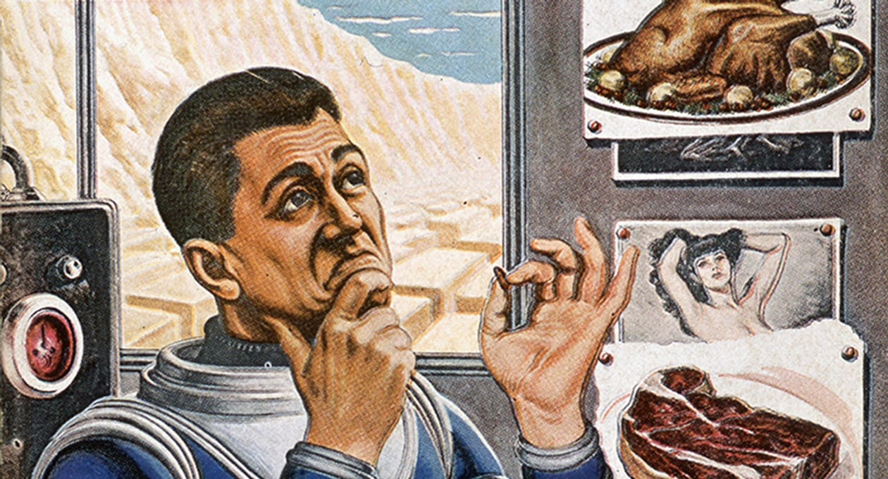 What it said about us, back then, was that we wanted more time and less domestic ritual. In the future, we'd get all our nutrition through pills and shakes. We wouldn't run or workout (who has the time?) but would take magic medicines that would render us healthy and fit without effort: Muscle tone and cardio health in a pill! Why not? Pharmaceutical science is the future, and nobody wants to get all sweaty. Get with the program, caveman!