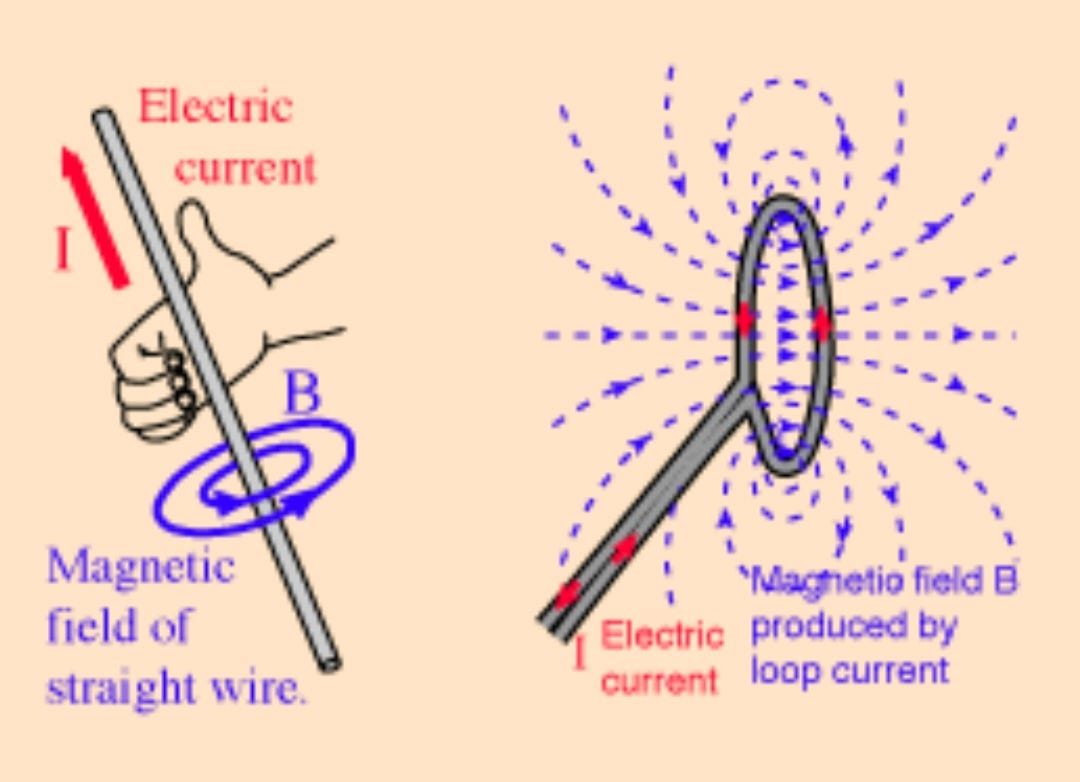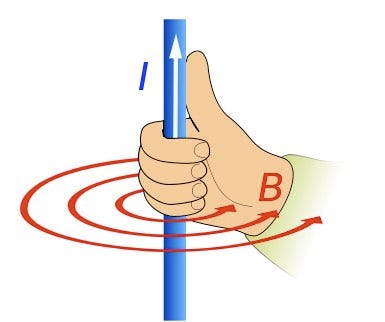 Hold out your right hand in front of you, without dropping this device if possible. Give a cheerful thumbs-up gesture, ignore any weird looks people throw you and check out the direction of your thumb and fingers. If your thumb is the direction of an electrical current then your curled up fingers are the direction of the induced magnetic field this creates.
