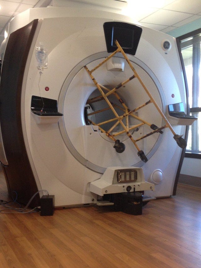 For comparison, a commercial non-research hospital MRI machine, the kind of thing that’s used to look at your spine to see if you’ve wrecked your back slouching over for years, will have a magnetic field of about 1.5 to 3 Tesla. That’s Tesla the magnetic field strength unit, not Tesla the car that’s become weirdly political all of a sudden. For an idea of how strong 1-3 Tesla is, take a look at any number of online videos showing what an MRI machine will do to a ferrous object anywhere nearby, such as this trolley.