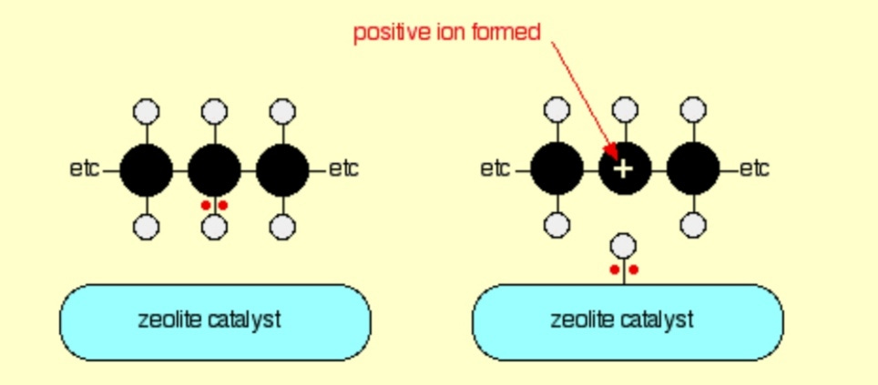 The catalyst typically targets the hydrogen bonds in a hydrocarbon chain, stripping a hydrogen atom and so making it easier for cracking to occur. The interaction also forms a positively charged ion, and this then goes onto interact and ionize other polymers in turn, so the effect moves through the solution long after the catalyst has knocked over the first domino.