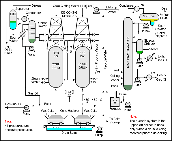 The bottoms from vacuum distillation is run at up to several bar through a furnace heat exchanger to bring it up to 475 celsius. It's mixed with steam to prevent early coking in the heat exchanger and is then introduced into one of the two coking drums.