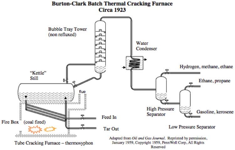 More advanced versions of the batch still refining process would be developed over the decades. For example, in the version above, many decades after Samuel Kier's designs, further pressure separators are added, plus a thermal cracking loop. The high pressure separators pick out the super-light and volatile hydrogen, methane and ethane gases, while the low pressure separators split ethane & propane gas from gasoline & kerosene liquid.