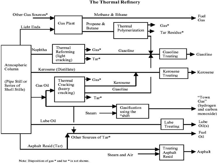 The temperatures & pressures required by thermal cracking are high: Between 450 and 750 celsius and anywhere up to 70 atmospheres of pressure. This is not a process for the faint hearted… but then, that's refining for you.