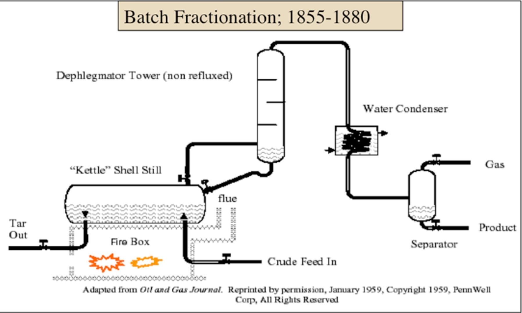 This is a bit more advanced than Samuel Kier's original design, but picks up on a few subjects we'll be covering as we go through the development of the refinery: Fractional Distillation, separation by pressure and thermal cracking.