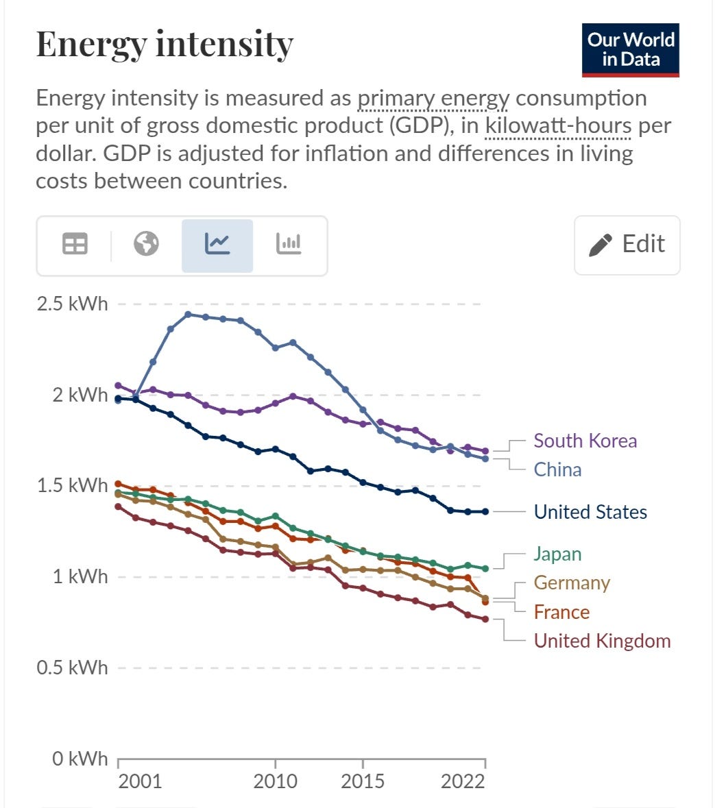 Don't forget that this has a long term effect on society, because people react to it. Take this graphic for example, showing the energy intensity of GDP for a selection of large economies, mostly energy importers. This is basically how many kilowatt-hours it takes to generate a dollar. What you will notice is two things: Firstly, the energy intensity of most economies is going down, as we get richer much faster than we increase energy consumption. That's a relief I suppose, or else a couple of centuries from now we'd all be dry-roasted by the waste heat from millions of fusion reactors.