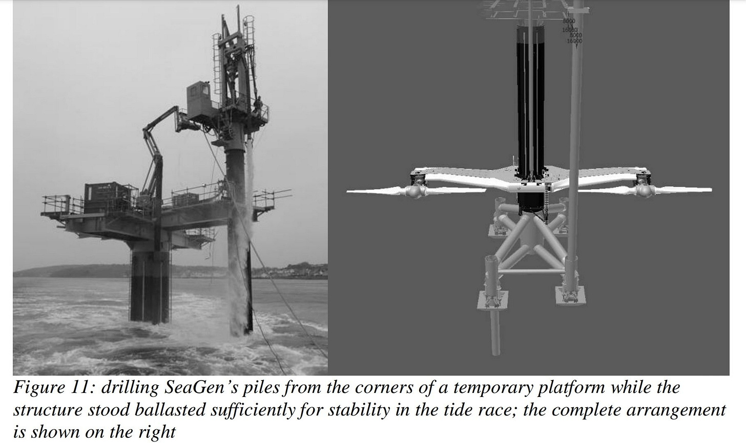 The Seagen turbine, a pile-secured beauty in Strangford Lough, Scotland, used a novel way to get around this: Initially mounting a working platform on top of a barge-placed structure with low water resistance, the working platform was then used to drill guide holes for four 9m depth pin piles which would mount the subsea structure at it’s corners into the seabed, using the initial barge-placed structure as a platform for pile driving. In this way, the work could be spread out over multiple slack water periods and the turbines only added after full structural reinforcement was complete. This was an artifact of Seagen’s unique design, which was a surface-piercing tower with two turbines mounted on arms from a central collar, which could rise above the water for maintenance. Placing it all in one go would have been difficult.