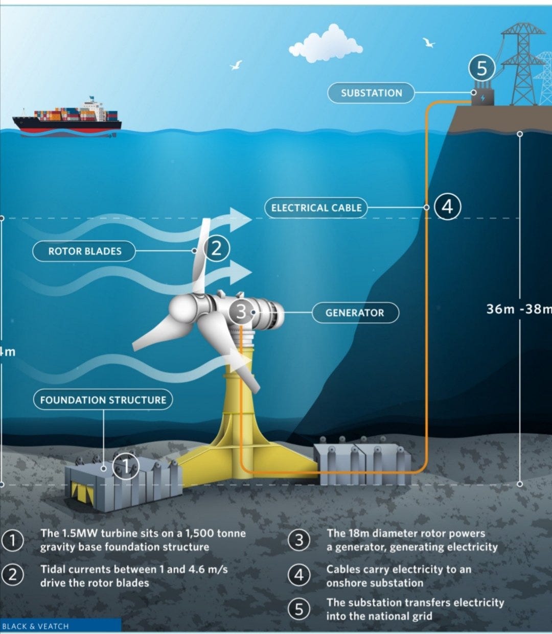 Across the world there are areas where natural geography creates channels or pinch-points in natural tidal flows, concentrating them and greatly increasing both their vertical range and velocity. One example of such a ‘tidal race’ is the Bay Of Fundy in Nova Scotia, where every six hours moves a water flow equivalent to three times all the rivers in the world combined. Other tidal races include the waters around the tangled archipelago of the Orkney Islands near Scotland, or the waters near the island of Alderney in the English channel, close to France. These tidal races worldwide, if peppered with tidal turbines, could potentially provide 1,000 TeraWatt-Hours of electricity a year, or a thousand-thousand-thousand-thousand kilowatt-hours. Or 20% of the electricity use of the United States.