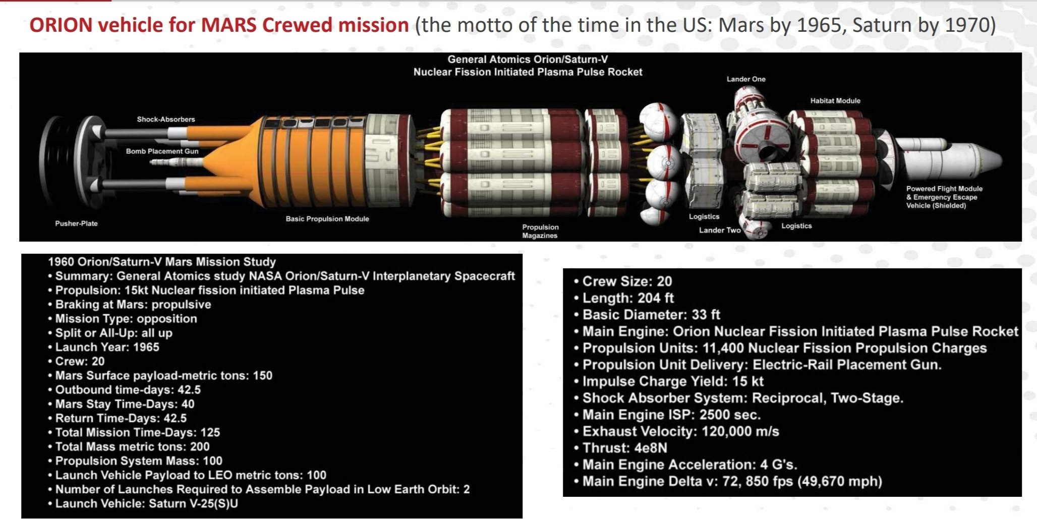 Sadly, the geopolitical and public health ramifications of a nuke-spitting spaceship are probably sufficient to put an end to Orion, which is a shame in a way, and a relief in another way. A spacecraft that casually flings out a superpower’s-worth of nuclear snap, crackle & pop is a bit of an ask.