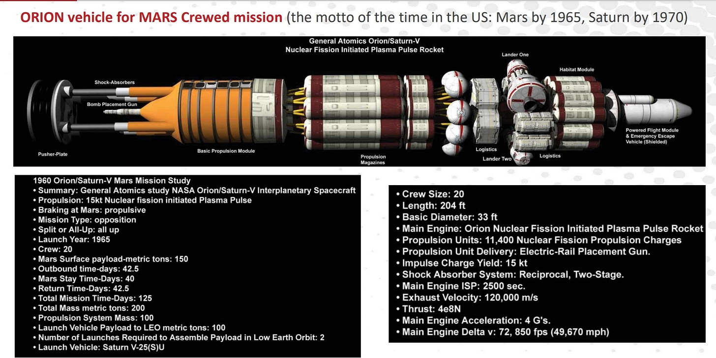 Simply put, Project Orion was a spaceship that periodically lobbed a nuclear bomb out of the rear and rode the blast. Then sent another, and another…