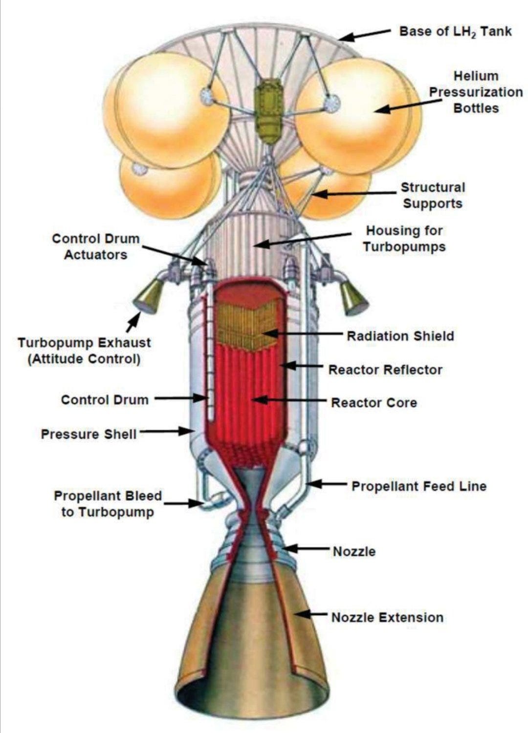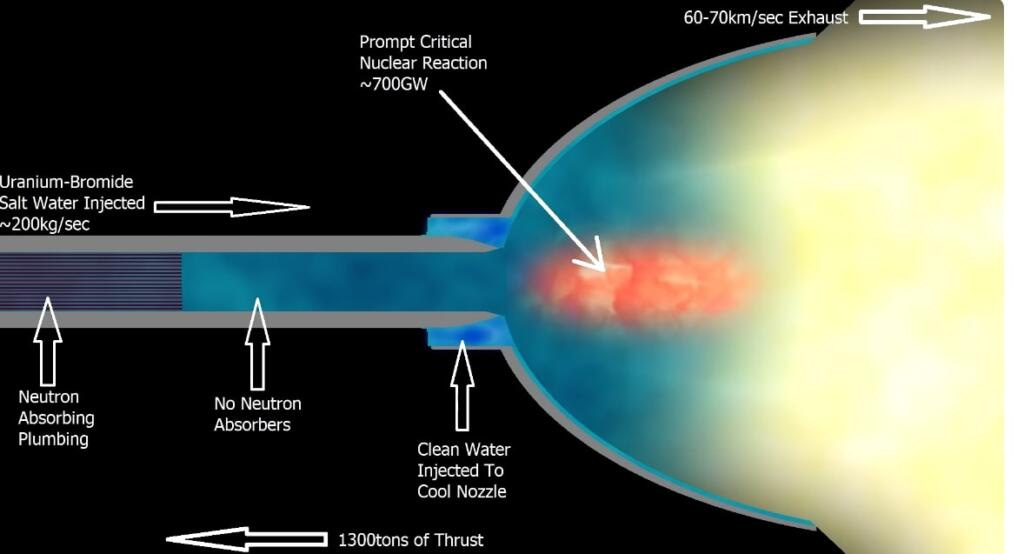 Simply put, in this pragmatic and terrifying creation, salts of either Plutonium or highly enriched Uranium salts (such as uranium tetrabromide) are dissolved in water and contained in a network of well-spaced boron carbide pipes. The water functions as a neutron moderator (promoting a fission reaction) and the boron carbide is a neutron absorber, which suppresses fission chain reactions, along with the physical separation of the salts while the fuel is in storage. The salt solution is then pumped at considerable pressure and velocity to a reaction chamber and a divergent nozzle and, brought to one spot and free of the cloying embrace of boron carbide, a prompt fission chain reaction occurs. This consumes much of the fissile U235 or plutonium, dissociates the water and creates a fast expanding plasma that reaches hundreds of kilometres per second exhaust velocity, depending on design. Even the ‘basic’ Zubrin design with 20% enriched Uranium gets you many megaNewtons of thrust and an exhaust velocity of 66km/s, which basically makes the solar system your plaything, as long as you don't mind holding your rodeo hat on and riding the last instant of the Chernobyl reactor all the way to your destination.