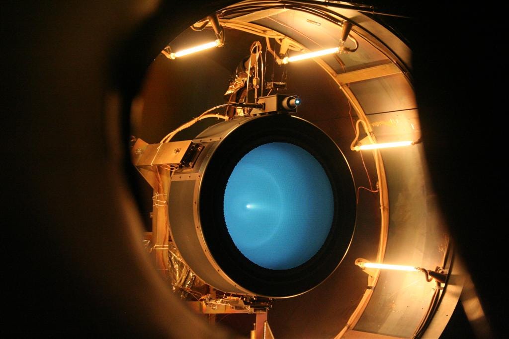 Ion engines could do better, relying on the acceleration of ions such as Xenon in a strong electric field (though other gases are available). These produce exhaust velocities and specific impulse figures about ten times higher than chemical rockets: You’re now knocking out exhaust at a velocity of 20-50 kilometres per second, although the drawback is that the actual thrust they’re capable of putting out is correspondingly feeble.
